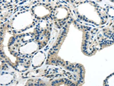 The image on the left is immunohistochemistry of paraffin-embedded Human thyroid cancer tissue using CSB-PA270025(IL-20 Antibody) at dilution 1/35, on the right is treated with synthetic peptide. (Original magnification: ×200)