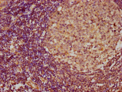 • IHC image of CSB-PA06737A0Rb diluted at 1:300 and staining in paraffin-embedded human lymph node tissue performed on a Leica BondTM system. After dewaxing and hydration, antigen retrieval was mediated by high pressure in a citrate buffer (pH 6.0). Section was blocked with 10% normal goat serum 30min at RT. Then primary antibody (1% BSA) was incubated at 4°C overnight. The primary is detected by a biotinylated secondary antibody and visualized using an HRP conjugated SP system.
