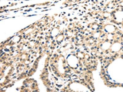 • The image on the left is immunohistochemistry of paraffin-embedded Human thyroid cancer tissue using CSB-PA442043(INHBB Antibody) at dilution 1/45, on the right is treated with synthetic peptide. (Original magnification: ×200)