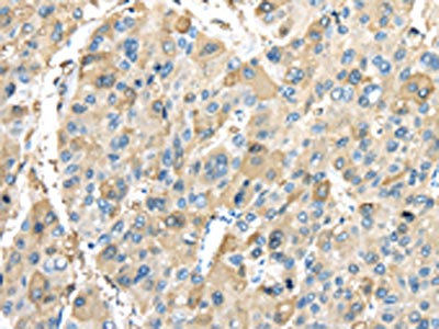 • The image on the left is immunohistochemistry of paraffin-embedded Human liver cancer tissue using CSB-PA442043(INHBB Antibody) at dilution 1/45, on the right is treated with synthetic peptide. (Original magnification: ×200)
