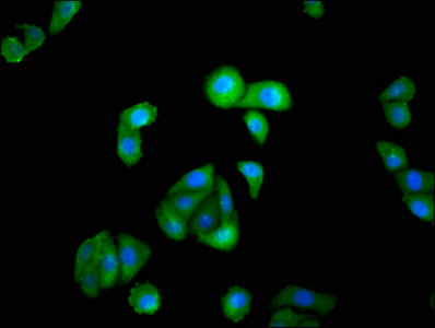 • Immunofluorescence staining of HepG2 cells with CSB-PA011824LA01HU at 1:100, counter-stained with DAPI. The cells were fixed in 4% formaldehyde, permeabilized using 0.2% Triton X-100 and blocked in 10% normal Goat Serum. The cells were then incubated with the antibody overnight at 4°C. The secondary antibody was Alexa Fluor 488-congugated AffiniPure Goat Anti-Rabbit IgG(H+L).