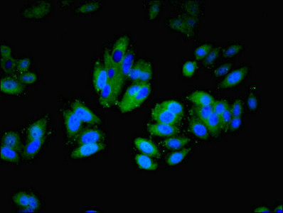Immunofluorescent analysis of HepG2 cells using CSB-PA011875LA01HU at dilution of 1:100 and Alexa Fluor 488-congugated AffiniPure Goat Anti-Rabbit IgG(H+L)