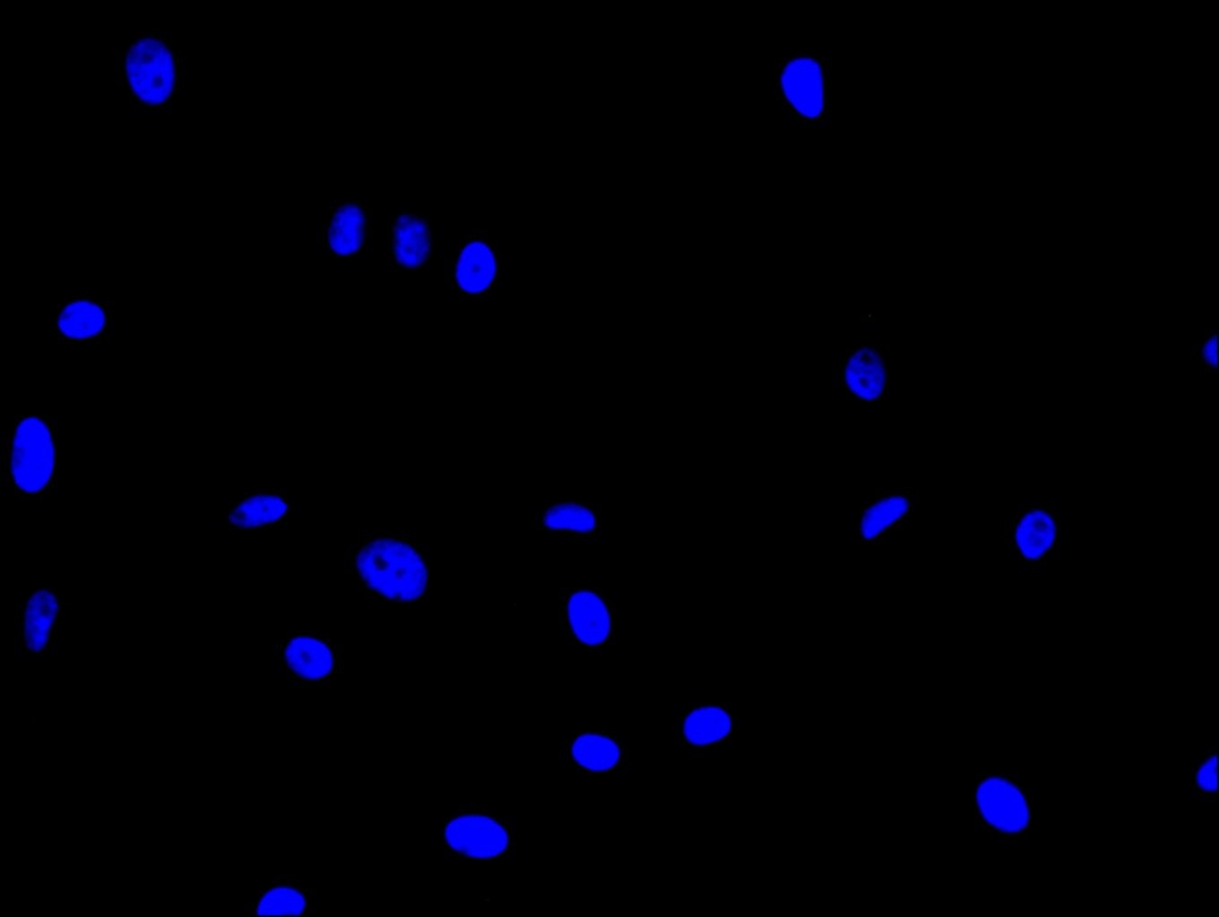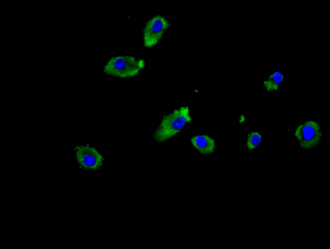 Immunofluorescence staining of A549 cells with CSB-PA011890LA01HU at 1:30, counter-stained with DAPI. The cells were fixed in 4% formaldehyde and blocked in 10% normal Goat Serum. The cells were then incubated with the antibody overnight at 4°C. The secondary antibody was Alexa Fluor 488-congugated AffiniPure Goat Anti-Rabbit IgG(H+L).