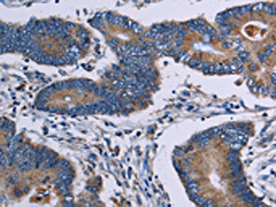• The image on the left is immunohistochemistry of paraffin-embedded Human colon cancer tissue using CSB-PA087882(ITK Antibody) at dilution 1/50, on the right is treated with fusion protein. (Original magnification: ×200)
