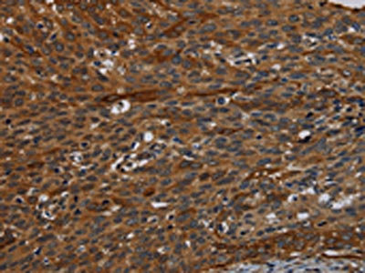 The image on the left is immunohistochemistry of paraffin-embedded Human cervical cancer tissue using CSB-PA779447(IVL Antibody) at dilution 1/50, on the right is treated with synthetic peptide. (Original magnification: ×200)