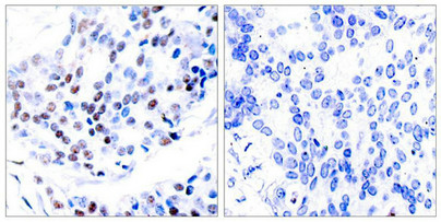 • Immunohistochemical analysis of paraffin-embedded human breast carcinoma tissue using c-Jun(Ab-239) Antibody(left) or the same antibody preincubated with blocking peptide(right).