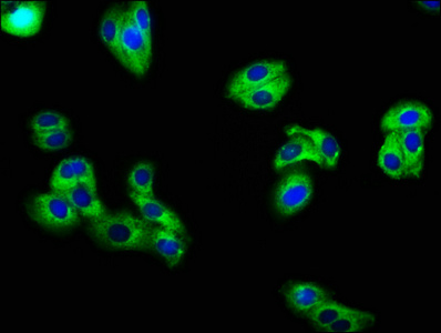 Immunofluorescence staining of HepG2 cells with CSB-PA22569A0Rb at 1:66, counter-stained with DAPI. The cells were fixed in 4% formaldehyde, permeabilized using 0.2% Triton X-100 and blocked in 10% normal Goat Serum. The cells were then incubated with the antibody overnight at 4°C. The secondary antibody was Alexa Fluor 488-congugated AffiniPure Goat Anti-Rabbit IgG(H+L).