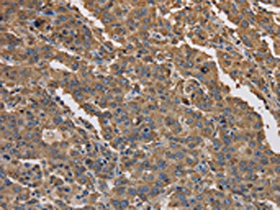 The image on the left is immunohistochemistry of paraffin-embedded Human liver cancer tissue using CSB-PA562372(KCNG1 Antibody) at dilution 1/40, on the right is treated with synthetic peptide. (Original magnification: ×200)