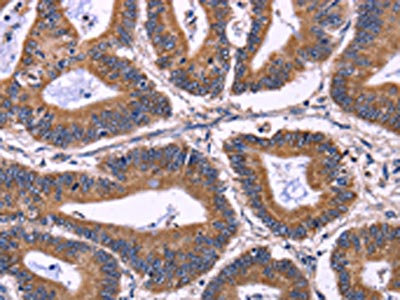 The image on the left is immunohistochemistry of paraffin-embedded Human colon cancer tissue using CSB-PA205578(KIR2DL3/KIR2DL1/KIR2DL4/KIR2DS4 Antibody) at dilution 1/40, on the right is treated with fusion protein. (Original magnification: ×200)