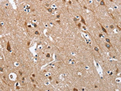 The image on the left is immunohistochemistry of paraffin-embedded Human brain tissue using CSB-PA959499(KLF7 Antibody) at dilution 1/40, on the right is treated with fusion protein. (Original magnification: ×200)