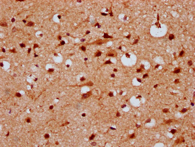 IHC image of CSB-PA22879A0Rb diluted at 1:300 and staining in paraffin-embedded human brain tissue performed on a Leica BondTM system. After dewaxing and hydration, antigen retrieval was mediated by high pressure in a citrate buffer (pH 6.0). Section was blocked with 10% normal goat serum 30min at RT. Then primary antibody (1% BSA) was incubated at 4°C overnight. The primary is detected by a biotinylated secondary antibody and visualized using an HRP conjugated SP system.