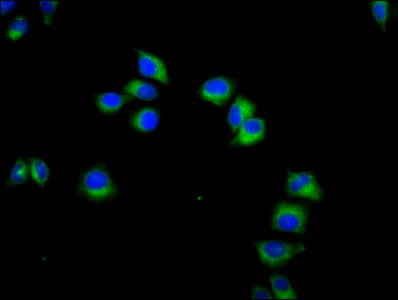 Immunofluorescence staining of Hela cells with CSB-PA23099A0Rb at 1:133, counter-stained with DAPI. The cells were fixed in 4% formaldehyde, permeabilized using 0.2% Triton X-100 and blocked in 10% normal Goat Serum. The cells were then incubated with the antibody overnight at 4°C. The secondary antibody was Alexa Fluor 488-congugated AffiniPure Goat Anti-Rabbit IgG(H+L).