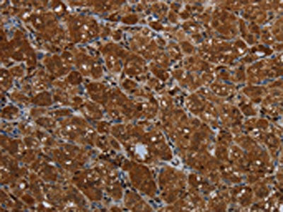 The image on the left is immunohistochemistry of paraffin-embedded Human thyroid cancer tissue using CSB-PA790773(KLRF1 Antibody) at dilution 1/25, on the right is treated with synthetic peptide. (Original magnification: ×200)