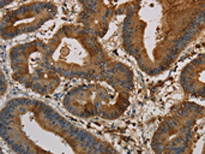 • The image on the left is immunohistochemistry of paraffin-embedded Human colon cancer tissue using CSB-PA616691(KRT16 Antibody) at dilution 1/30, on the right is treated with synthetic peptide. (Original magnification: ×200)