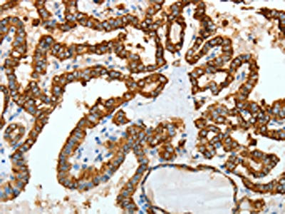 • The image on the left is immunohistochemistry of paraffin-embedded Human thyroid cancer tissue using CSB-PA243997(KRT18 Antibody) at dilution 1/30, on the right is treated with fusion protein. (Original magnification: ×200)