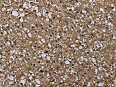 The image on the left is immunohistochemistry of paraffin-embedded Human liver cancer tissue using CSB-PA202913(KSR1 Antibody) at dilution 1/25, on the right is treated with synthetic peptide. (Original magnification: ×200)