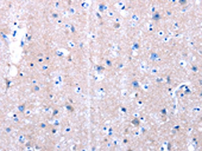 The image on the left is immunohistochemistry of paraffin-embedded Human brain tissue using CSB-PA140473(LAMA3 Antibody) at dilution 1/10, on the right is treated with synthetic peptide. (Original magnification: ×200)