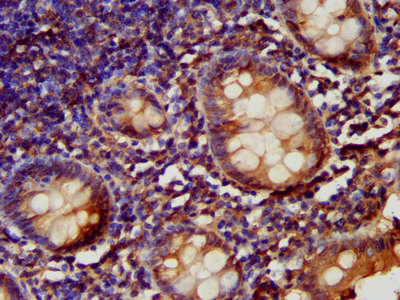 IHC image of CSB-PA887112LA01HU diluted at 1:200 and staining in paraffin-embedded human appendix tissue performed on a Leica BondTM system. After dewaxing and hydration, antigen retrieval was mediated by high pressure in a citrate buffer (pH 6.0). Section was blocked with 10% normal goat serum 30min at RT. Then primary antibody (1% BSA) was incubated at 4°C overnight. The primary is detected by a biotinylated secondary antibody and visualized using an HRP conjugated SP system.