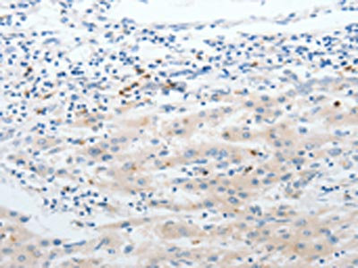 The image on the left is immunohistochemistry of paraffin-embedded Human liver cancer tissue using CSB-PA076130(LCN2 Antibody) at dilution 1/50, on the right is treated with synthetic peptide. (Original magnification: ×200)