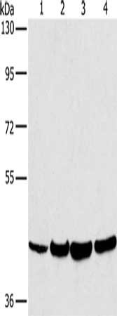 • Gel: 8%SDS-PAGE, Lysate: 40 μg, Lane 1-4: Mouse lung tissue, Mouse liver tissue, hela cells, MCF7 cells, Primary antibody: CSB-PA284372(LILRA1 Antibody) at dilution 1/250, Secondary antibody: Goat anti rabbit IgG at 1/8000 dilution, Exposure time: 30 seconds