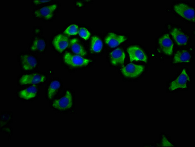 Immunofluorescence staining of A549 cells with CSB-PA848833LA01HU at 1:66, counter-stained with DAPI. The cells were fixed in 4% formaldehyde, permeabilized using 0.2% Triton X-100 and blocked in 10% normal Goat Serum. The cells were then incubated with the antibody overnight at 4°C. The secondary antibody was Alexa Fluor 488-congugated AffiniPure Goat Anti-Rabbit IgG(H+L).