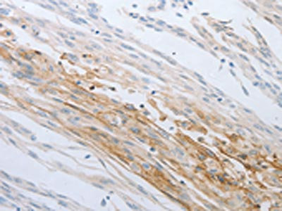 The image on the left is immunohistochemistry of paraffin-embedded Human gastric cancer tissue using CSB-PA130669(LOX Antibody) at dilution 1/30, on the right is treated with synthetic peptide. (Original magnification: ×200)