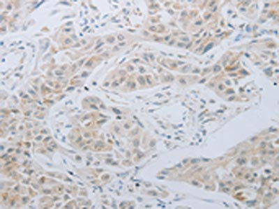 The image on the left is immunohistochemistry of paraffin-embedded Human lung cancer tissue using CSB-PA061510(LOX Antibody) at dilution 1/30, on the right is treated with synthetic peptide. (Original magnification: ×200)