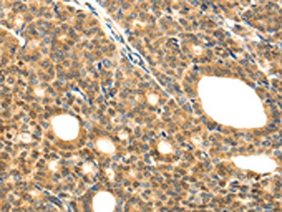 The image on the left is immunohistochemistry of paraffin-embedded Human thyroid cancer tissue using CSB-PA954164(LYZ Antibody) at dilution 1/20, on the right is treated with fusion protein. (Original magnification: ×200)
