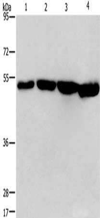 Gel: 8%SDS-PAGE, Lysate: 40 μg, Lane 1-4: A431 cells, A375 cells, hela cells, Jurkat cells, Primary antibody: CSB-PA903964(MAF Antibody) at dilution 1/1100, Secondary antibody: Goat anti rabbit IgG at 1/8000 dilution, Exposure time: 5 seconds