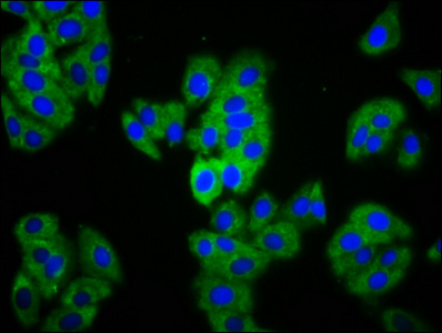 Immunofluorescence staining of HepG2 cells with CSB-PA857014LA01HU at 1:133, counter-stained with DAPI. The cells were fixed in 4% formaldehyde, permeabilized using 0.2% Triton X-100 and blocked in 10% normal Goat Serum. The cells were then incubated with the antibody overnight at 4°C. The secondary antibody was Alexa Fluor 488-congugated AffiniPure Goat Anti-Rabbit IgG(H+L).