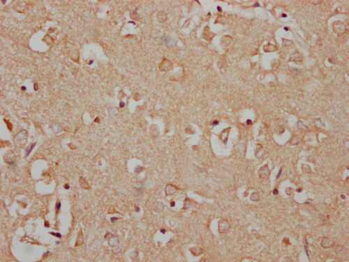 IHC image of CSB-PA013429NA187nphHU diluted at 1:100 and staining in paraffin-embedded human brain tissue performed on a Leica BondTM system. After dewaxing and hydration, antigen retrieval was mediated by high pressure in a citrate buffer (pH 6.0). Section was blocked with 10% normal goat serum 30min at RT. Then primary antibody (1% BSA) was incubated at 4°C overnight. The primary is detected by a Goat anti-rabbit IgG labeled by HRP and visualized using 0.05% DAB.