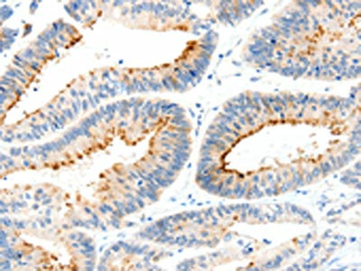 • The image on the left is immunohistochemistry of paraffin-embedded Human colon cancer tissue using CSB-PA900670(MAP4K1 Antibody) at dilution 1/30, on the right is treated with synthetic peptide. (Original magnification: ×200)