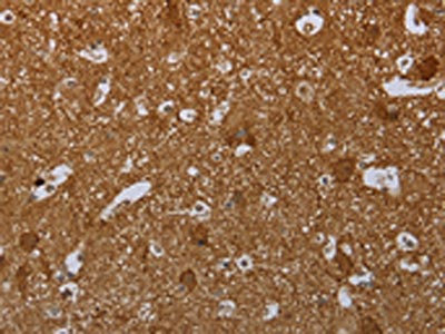 The image on the left is immunohistochemistry of paraffin-embedded Human brain tissue using CSB-PA850358(MARK1 Antibody) at dilution 1/40, on the right is treated with synthetic peptide. (Original magnification: ×200)