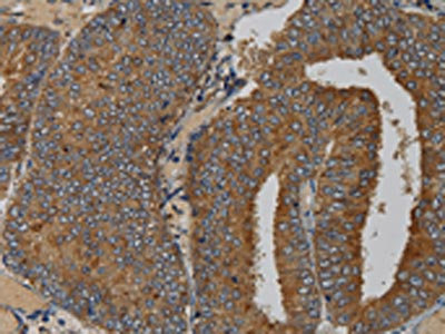 The image on the left is immunohistochemistry of paraffin-embedded Human colon cancer tissue using CSB-PA084695(MAS1 Antibody) at dilution 1/50, on the right is treated with fusion protein. (Original magnification: ×200)
