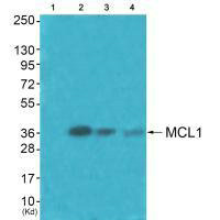 Western blot analysis of extracts from HuvEc cells (Lane 2), JK cells (Lane 3) and cos-7 cells (Lane 4), using MCL1 antiobdy. The lane on the left is treated with synthesized peptide.