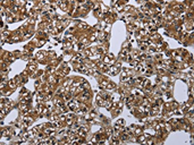 The image on the left is immunohistochemistry of paraffin-embedded Human thyroid cancer tissue using CSB-PA287547(ME1 Antibody) at dilution 1/20, on the right is treated with synthetic peptide. (Original magnification: ×200)