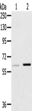 Gel: 8%SDS-PAGE, Lysate: 40 μg, Lane 1-2: 293T cells, A431 cells, Primary antibody: CSB-PA287547(ME1 Antibody) at dilution 1/200, Secondary antibody: Goat anti rabbit IgG at 1/8000 dilution, Exposure time: 15 seconds