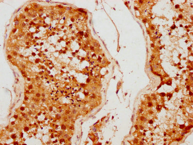 IHC image of CSB-PA013659LA01HU diluted at 1:500 and staining in paraffin-embedded human testis tissue performed on a Leica BondTM system. After dewaxing and hydration, antigen retrieval was mediated by high pressure in a citrate buffer (pH 6.0). Section was blocked with 10% normal goat serum 30min at RT. Then primary antibody (1% BSA) was incubated at 4°C overnight. The primary is detected by a biotinylated secondary antibody and visualized using an HRP conjugated SP system.