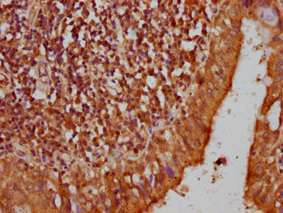 • IHC image of CSB-PA013675LA01HU diluted at 1:200 and staining in paraffin-embedded human lung tissue performed on a Leica BondTM system. After dewaxing and hydration, antigen retrieval was mediated by high pressure in a citrate buffer (pH 6.0). Section was blocked with 10% normal goat serum 30min at RT. Then primary antibody (1% BSA) was incubated at 4°C overnight. The primary is detected by a biotinylated secondary antibody and visualized using an HRP conjugated SP system.