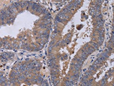The image on the left is immunohistochemistry of paraffin-embedded Human colon cancer tissue using CSB-PA569334(MKKS Antibody) at dilution 1/50, on the right is treated with fusion protein. (Original magnification: ×200)