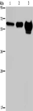 Gel: 8%SDS-PAGE, Lysate: 40 μg, Lane 1-3: 823 cells, mouse brain tissue, human fetal brain tissue, Primary antibody: CSB-PA448064(MMP20 Antibody) at dilution 1/400, Secondary antibody: Goat anti rabbit IgG at 1/8000 dilution, Exposure time: 20 seconds