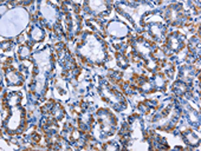 • The image on the left is immunohistochemistry of paraffin-embedded Human thyroid cancer tissue using CSB-PA989166(MPO Antibody) at dilution 1/50, on the right is treated with fusion protein. (Original magnification: ×200)