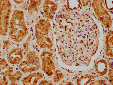 IHC image of CSB-PA883456LA01HU diluted at 1:200 and staining in paraffin-embedded human kidney tissue performed on a Leica BondTM system. After dewaxing and hydration, antigen retrieval was mediated by high pressure in a citrate buffer (pH 6.0). Section was blocked with 10% normal goat serum 30min at RT. Then primary antibody (1% BSA) was incubated at 4°C overnight. The primary is detected by a biotinylated secondary antibody and visualized using an HRP conjugated SP system.