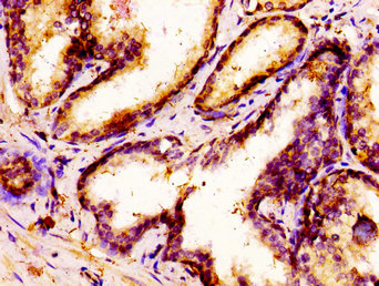 IHC image of CSB-PA015068LA01HU diluted at 1:300 and staining in paraffin-embedded human prostate cancer performed on a Leica BondTM system. After dewaxing and hydration, antigen retrieval was mediated by high pressure in a citrate buffer (pH 6.0). Section was blocked with 10% normal goat serum 30min at RT. Then primary antibody (1% BSA) was incubated at 4°C overnight. The primary is detected by a biotinylated secondary antibody and visualized using an HRP conjugated SP system.