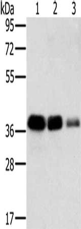 • Gel: 8%SDS-PAGE, Lysate: 40 μg, Lane 1-3: A549 cells, HT29 cells, A172 cells, Primary antibody: CSB-PA782082(MTFR1 Antibody) at dilution 1/500, Secondary antibody: Goat anti rabbit IgG at 1/8000 dilution, Exposure time: 5 seconds