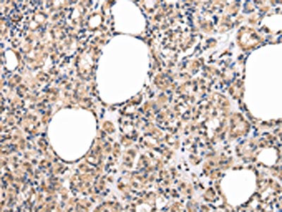 The image on the left is immunohistochemistry of paraffin-embedded Human thyroid cancer tissue using CSB-PA064912(MUC1(NT) Antibody) at dilution 1/20, on the right is treated with synthetic peptide. (Original magnification: ×200)