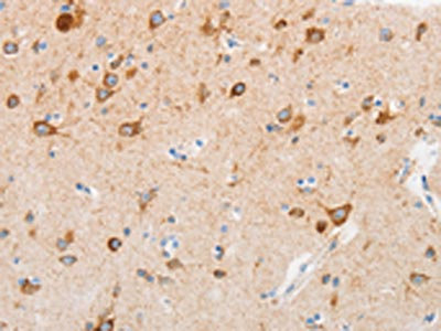 • The image on the left is immunohistochemistry of paraffin-embedded Human brain tissue using CSB-PA131838(MUC13 Antibody) at dilution 1/30, on the right is treated with synthetic peptide. (Original magnification: ×200)