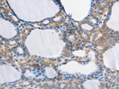• The image on the left is immunohistochemistry of paraffin-embedded Human thyroid cancer tissue using CSB-PA131838(MUC13 Antibody) at dilution 1/30, on the right is treated with synthetic peptide. (Original magnification: ×200)