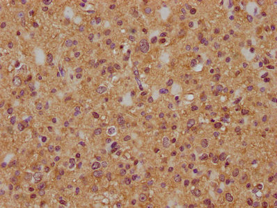 IHC image of CSB-PA856414LA01HU diluted at 1:200 and staining in paraffin-embedded human glioma cancer performed on a Leica BondTM system. After dewaxing and hydration, antigen retrieval was mediated by high pressure in a citrate buffer (pH 6.0). Section was blocked with 10% normal goat serum 30min at RT. Then primary antibody (1% BSA) was incubated at 4°C overnight. The primary is detected by a biotinylated secondary antibody and visualized using an HRP conjugated SP system.