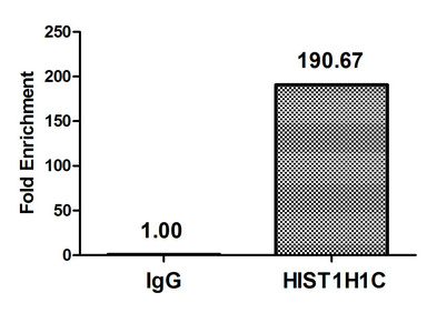 Chromatin Immunoprecipitation Hela (4*106) were treated with Micrococcal Nuclease, sonicated, and immunoprecipitated with 8µg anti-HIST1H1C (CSB-PA010378PA186me1HU) or a control normal rabbit IgG. The resulting ChIP DNA was quantified using real-time PCR with primers against the β-Globin promoter.